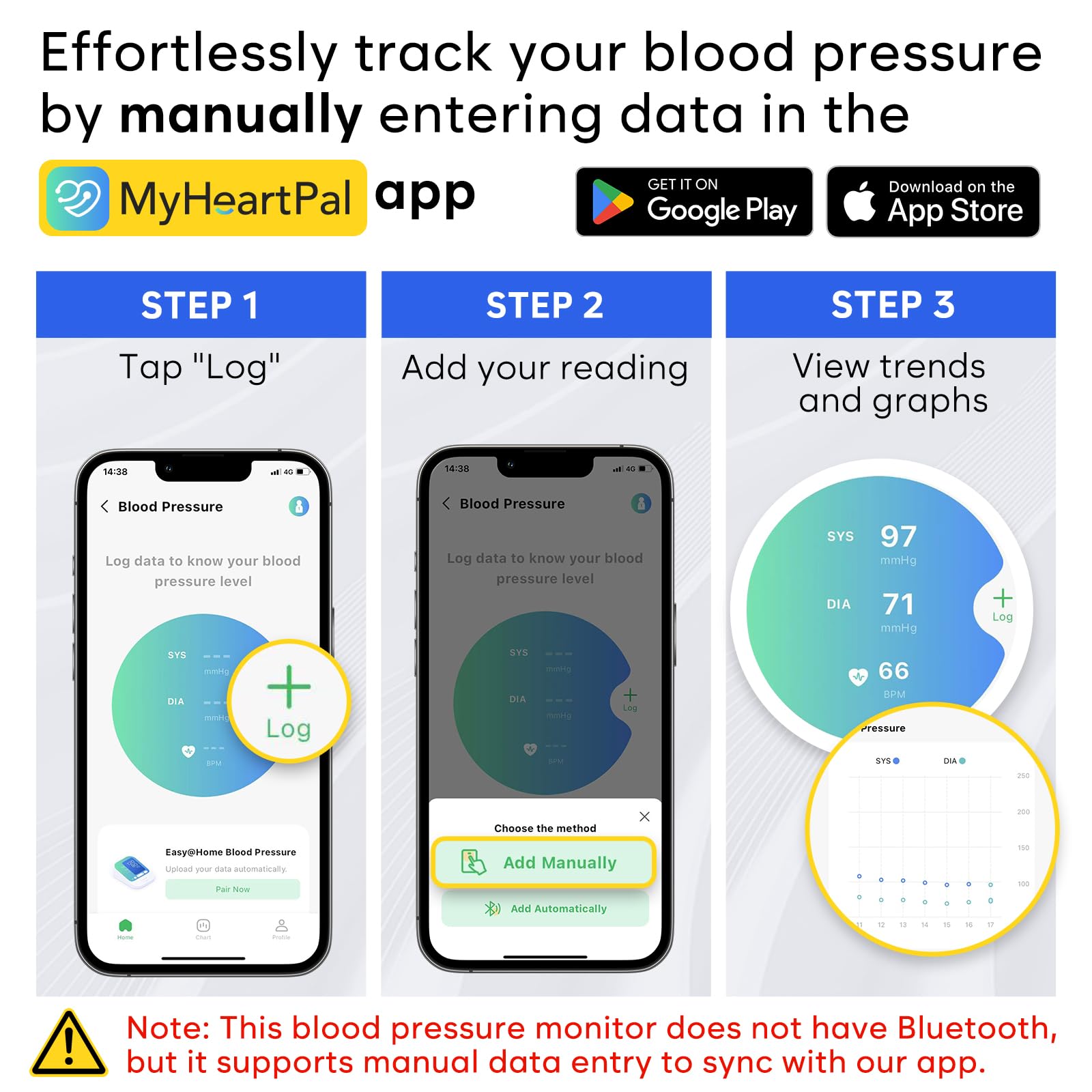 - 2 Users & 120 Memory on the Monitor, Unlimited with App: The monitor can store up to 120 measurements, with 60 records per user. Plus, with the free MyHeartPal app, you can easily track and store unlimited blood pressure readings on your phone. You can also share reports with your family or doctor and sync data with Apple Health. Note: This monitor is not Bluetooth-enabled; data must be manually entered into the app