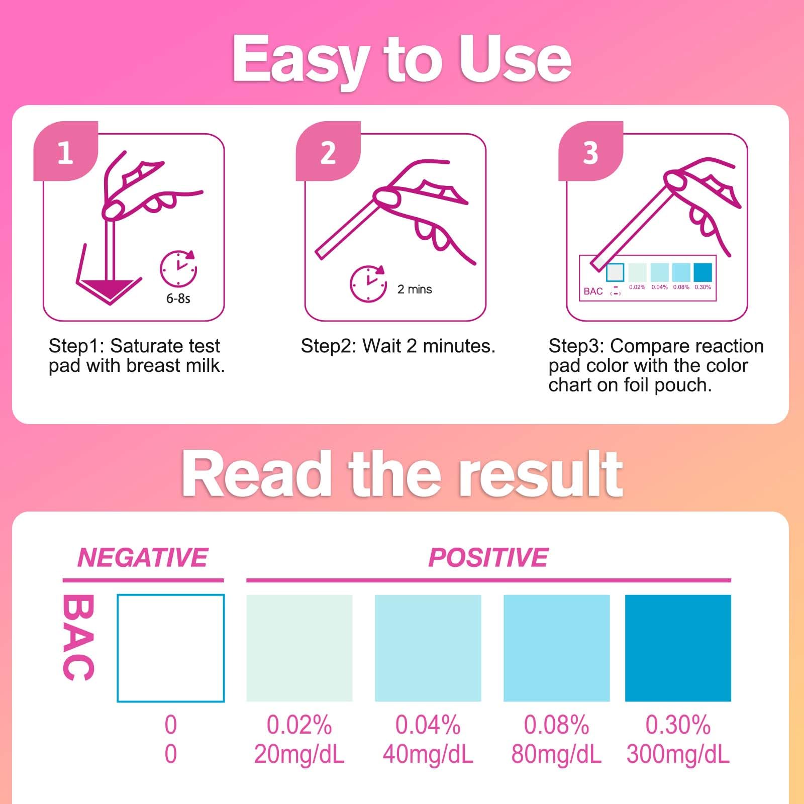 - ★EASY TO USE AND EASY TO READ: Just saturate the test pad with breast milk and read results at 2 minutes. The concentration of alcohol is represented by visually comparing the color of the reaction pads with the color chart to determine the relative blood alcohol level.
