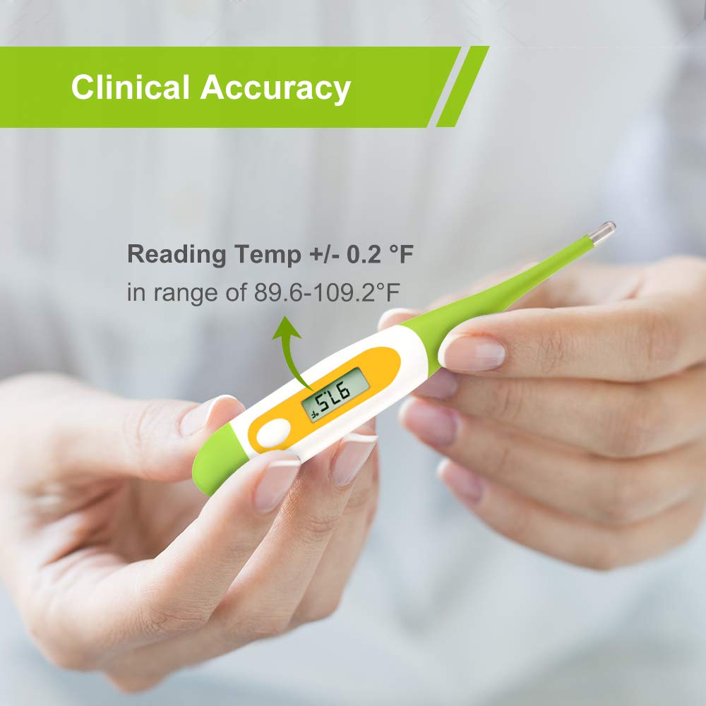 - ORAL THERMOMETER WITH FLEXIBLE TIP: The Extra soft and flexible tip, making for quick and comfortable measurements for family; Waterproof tip allows you to clean the thermometer easily by wiping or rinsing.