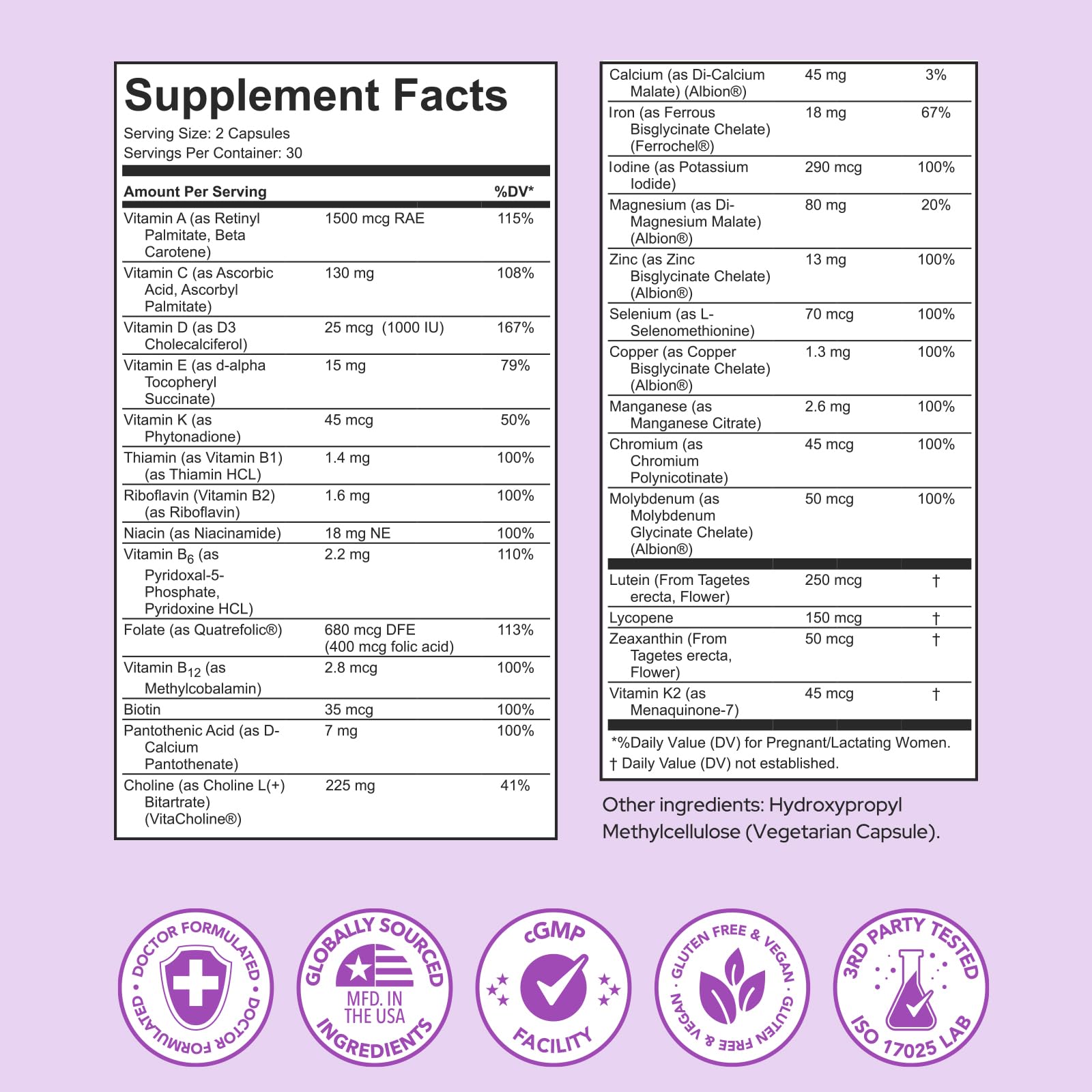 - Female Doctor Formulated: Our 2025 Best New Product Award-winning Prenatal Multi is doctor formulated for women in preconception, trying to conceive, pregnant, and postpartum stages.* It features 60 veggie capsules (30 servings) packaged with a pleasant lemon scent and 27 key vitamins and minerals.